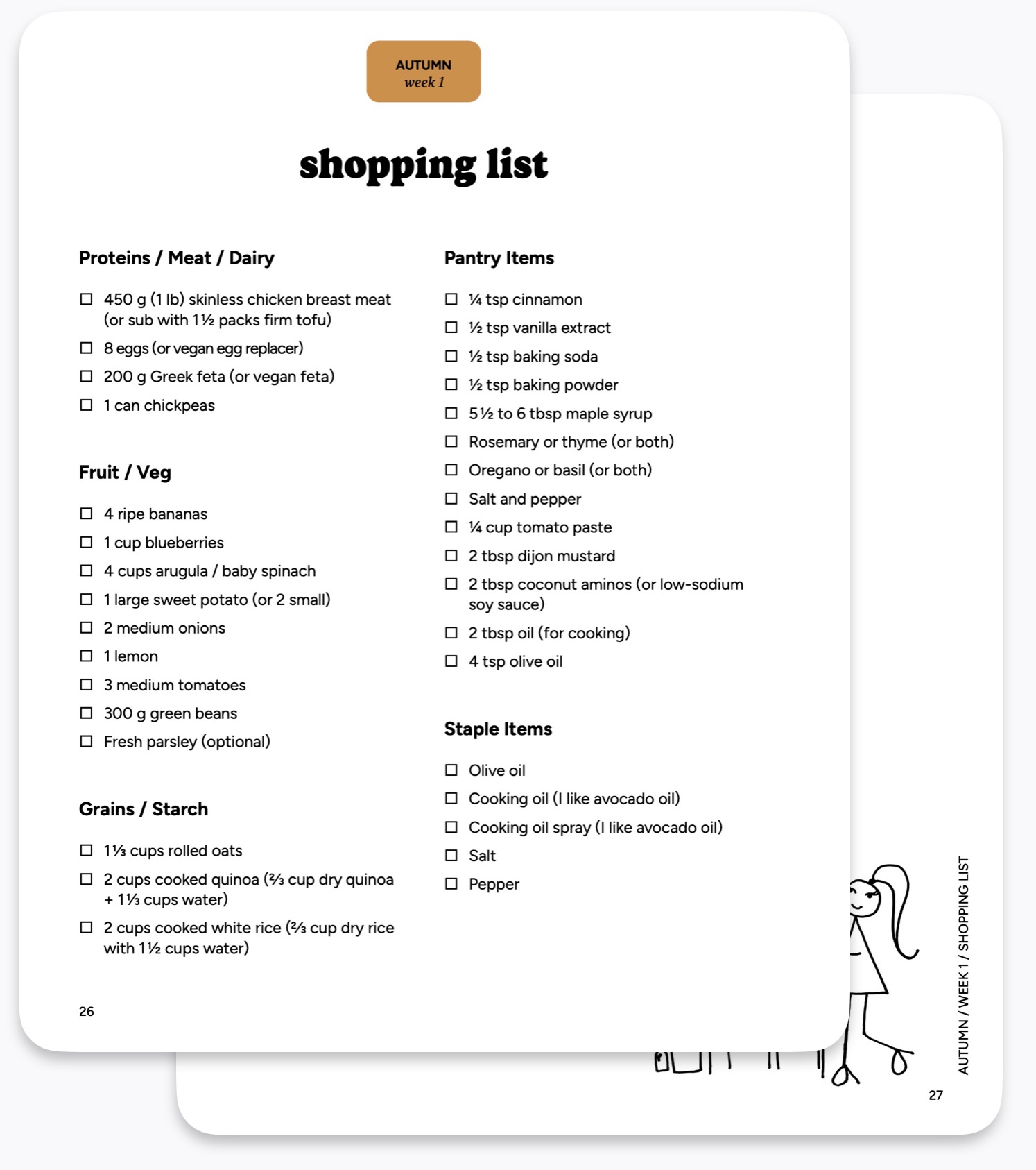 Here’s the shopping list for “Autumn Week 1” – straight from my Meal Prep for the Busy Girl book (scroll down if you’d like to see the full book with all 12 weeks). You can download this shopping list for free and follow along with the video!