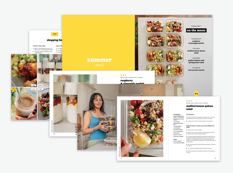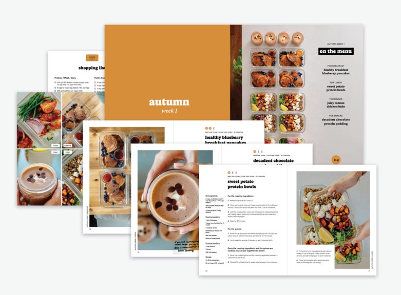In a nutshell, it’s 306 pages of recipes, meal plans, and my top tips to help you lose weight and maintain your ideal weight in the long run. You can use this book just like a regular recipe book, or as a meal prep book complete with recipes, storing and prep instructions, meal plans, and the included shopping lists. All the meals are roughly 400 calories, and all the snacks are roughly 200 calories. This means that all meals and snacks are interchangeable so you can customize your own plan with any of the recipes in this book!